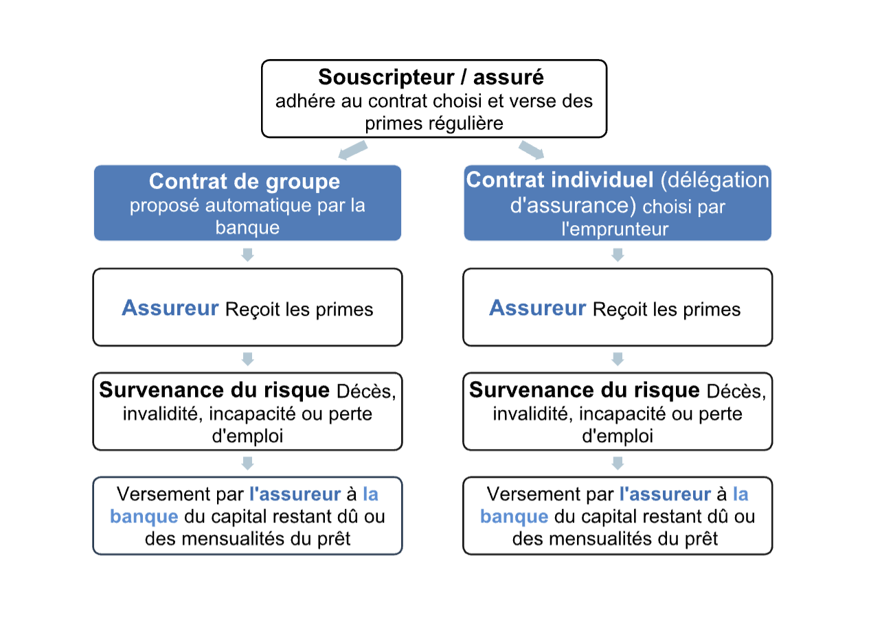 Il est important de bien choisir entre le contrat de groupe proposé par labanque et le contrat individuel (délégation d’assurance) :